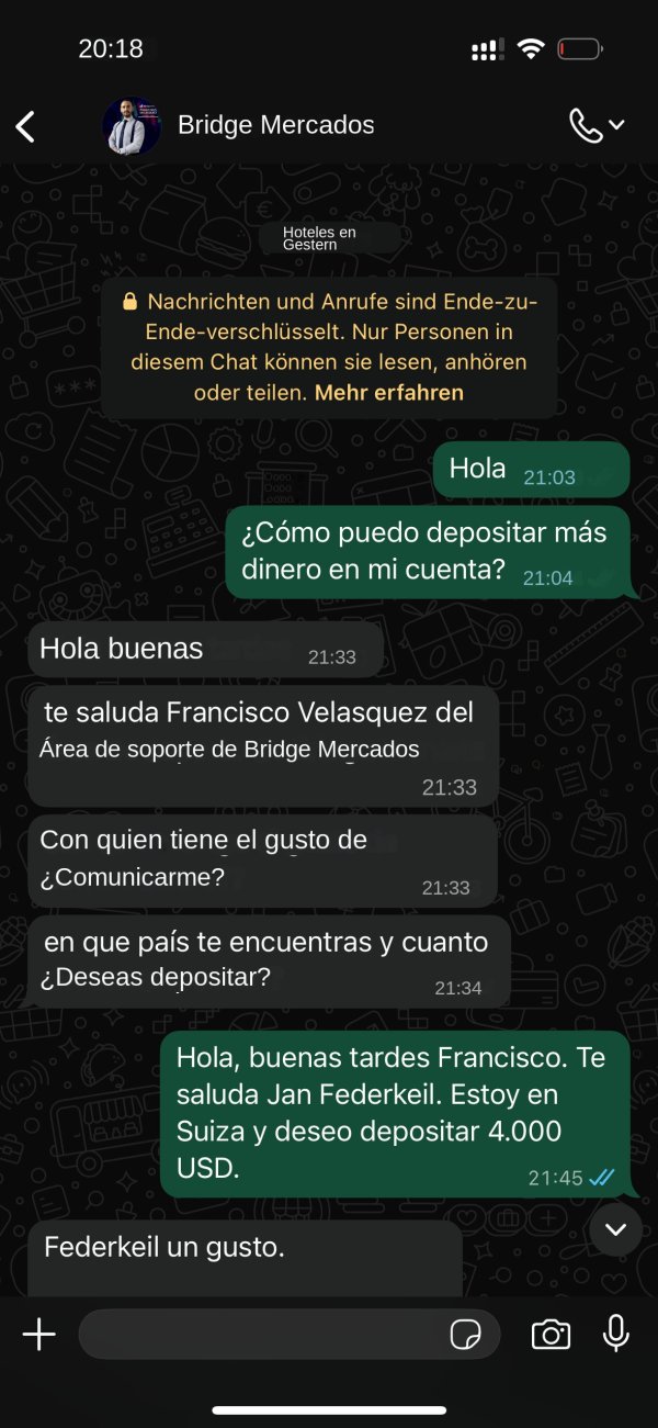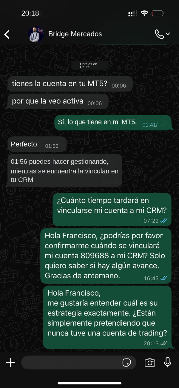 Bridge Markets es un nivel completamente nuevo de estafa según mi experiencia. De la nada bloquearon mi cuenta y desconectaron mi cuenta de trading MT5 de su CRM mientras tenía más de 6,000 USD. Ya no podía ver ni acceder a los fondos.