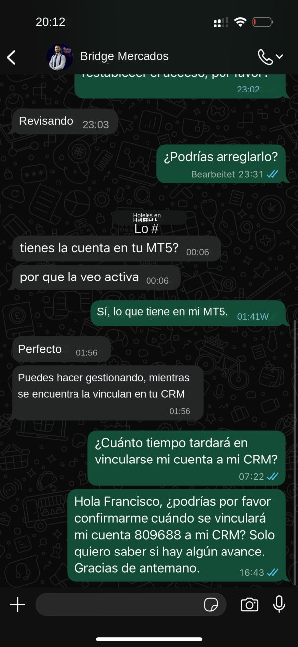 Tengo capturas de pantalla del chat de soporte, mi cuenta MT5 y el CRM mostrando la desconexión. Los he contactado varias veces y aún no hay respuesta sobre restaurar el acceso o liberar mi dinero.