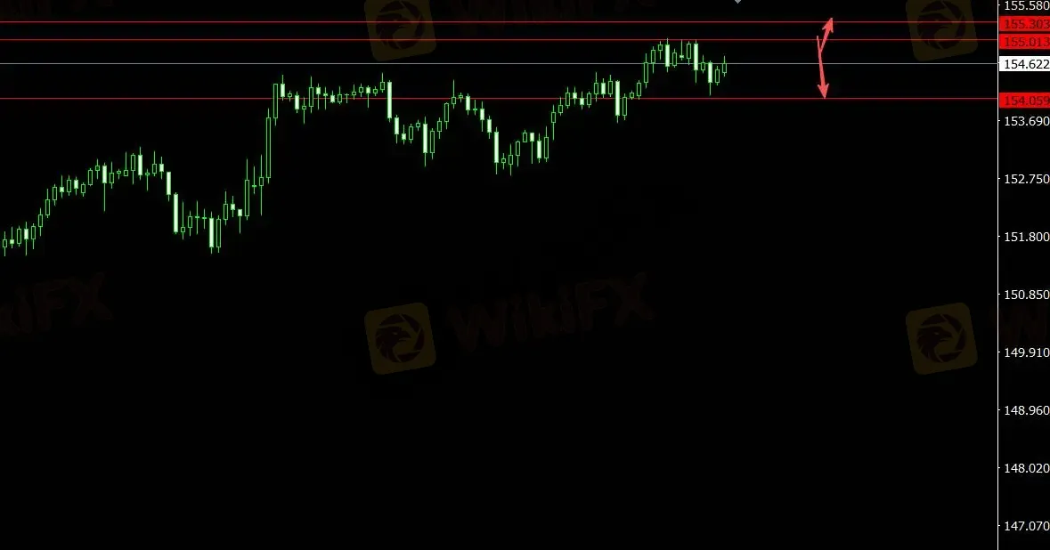 美元指数受支撑,日元上涨,关注支撑位154.060,4小时看多至155.310;关注压力位155.010,4小时看空至153.680。