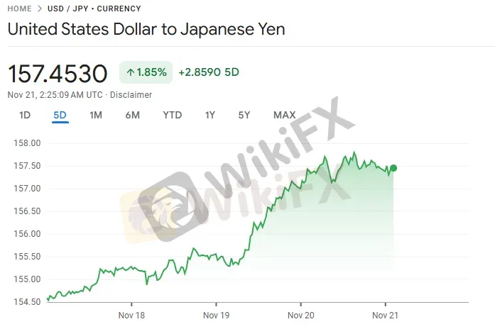 11 月 20 日至 21 日,市场担忧中日关系紧张及日本进一步刺激经济将扩大财政赤字,导致日圆与国债遭到抛售。日圆持续走弱,已连续第四个交易日下跌,一度触及 157.7 日圆兑 1 美元,为今年 1 月中以来最低水平。每百日圆兑港元跌破 5 元关口,盘中一度至 4.95 以下。日本 10 年期国债收益率升至 1.8%,创近 17 年半新高。