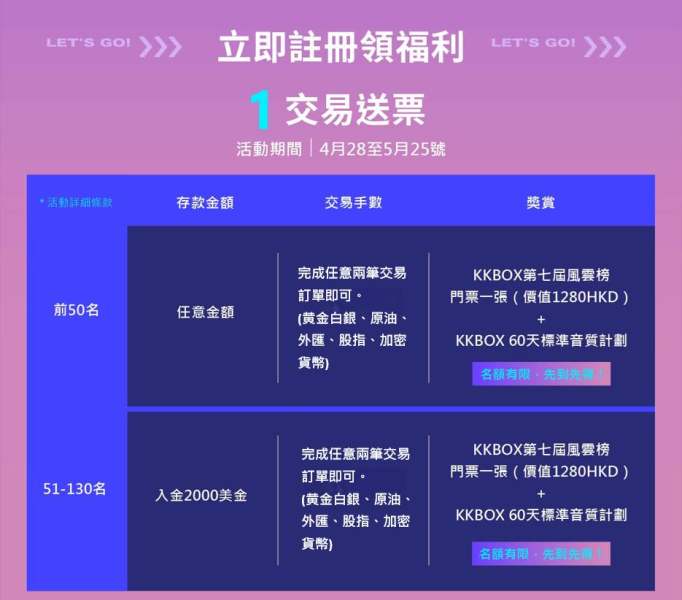 門票活動,活动入金不限金額最低50美元,任意完成兩筆超過5分鐘的交易訂單,即可申請門票