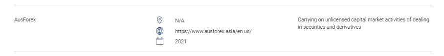 “本節包含未經授權的網站、投資產品、公司和個人的列表。該列表包括:未經 SC 許可進行或自稱進行以下受監管活動的人員:證券交易;衍生品交易;以及基金管理; 企業財務諮詢; 投資建議; 財務規劃;以及 私人退休計劃交易。 未經授權經營認可市場的人員。 未經批准、授權或認可發行或發行證券的人員。 濫用 SC 徽標並歪曲 SC 的人員。 " AusForex N/A https://www.ausforex.asia/en us/ 2021 進行未經許可的證券及衍生品交易資本市場活動
